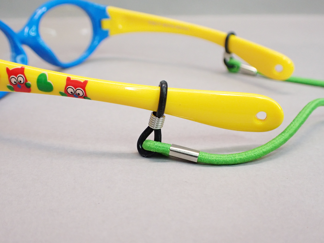 Sznurek zakończony jest gumowymi końcówkami, które pewnie utrzymują okulary na miejscu, a regulowany element zaciskowy umożliwia łatwe dopasowanie do indywidualnych potrzeb użytkownika.